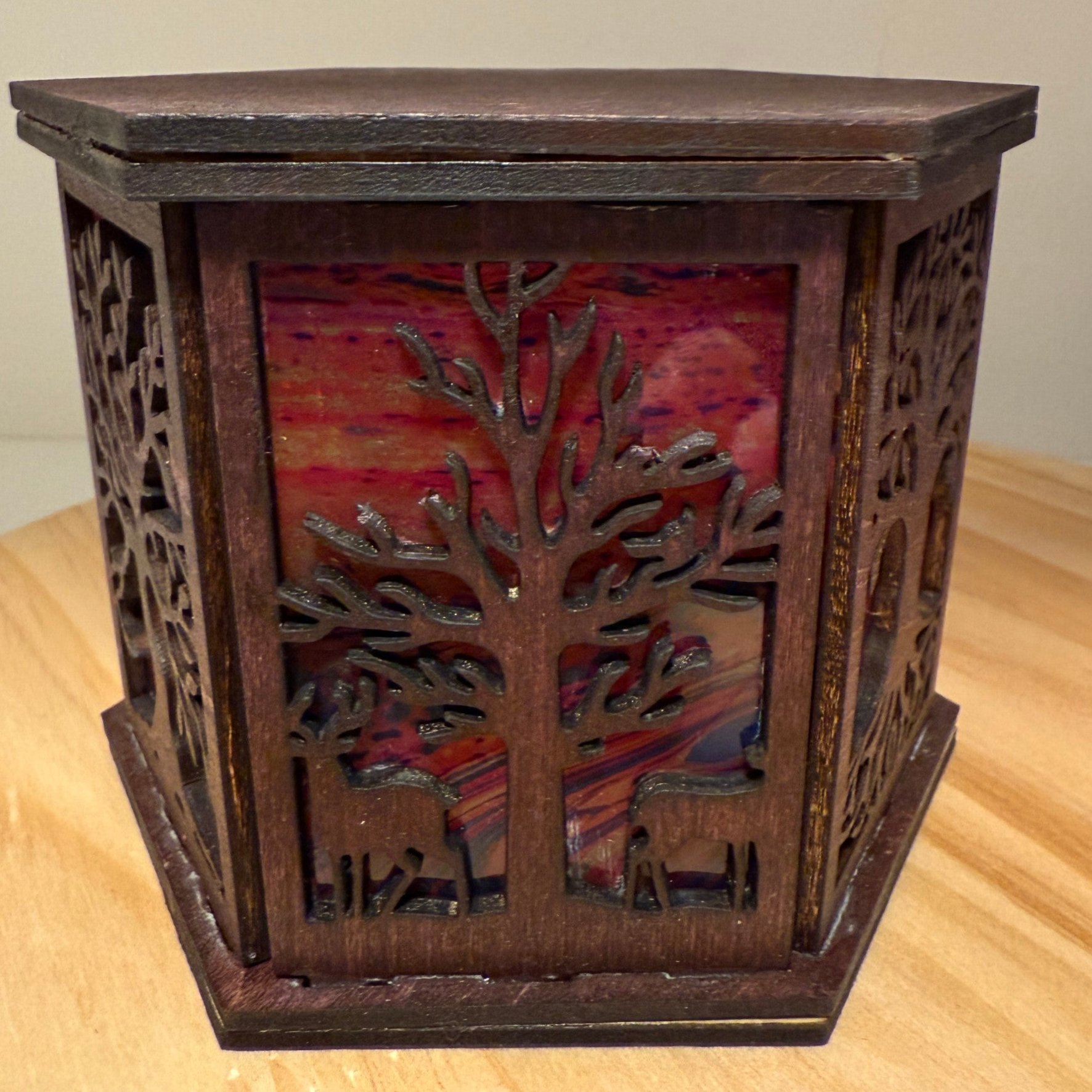 Made out of basswood. Stained with Varathane Black Cherry. Comes with 3.5' of battery operated fairy lights. Product height is 3.625" and width is 4.25". Pictures are of the item you will receive.