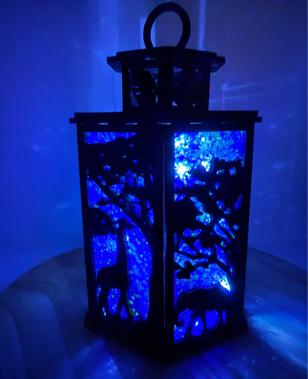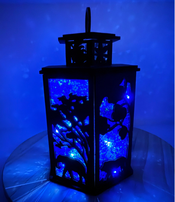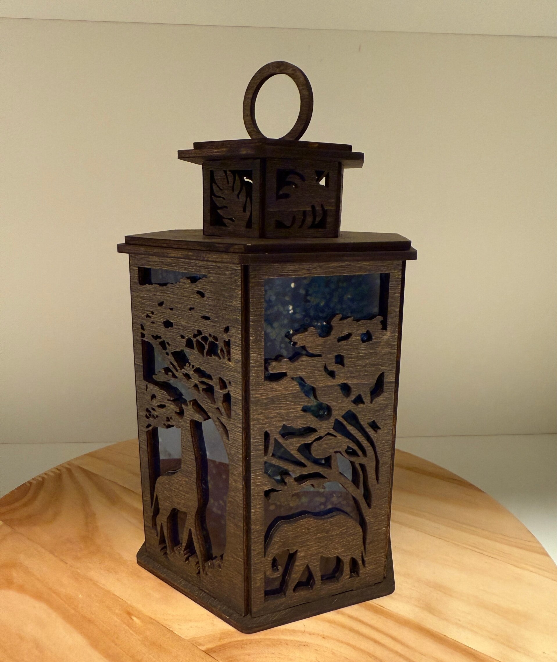 Made out of Basswood. It has been stained with Varathane Kona.  The height is 8.5" and the width is 6".  Comes with 7' battery operated fairy lights.  The pics are of the product you will receive.