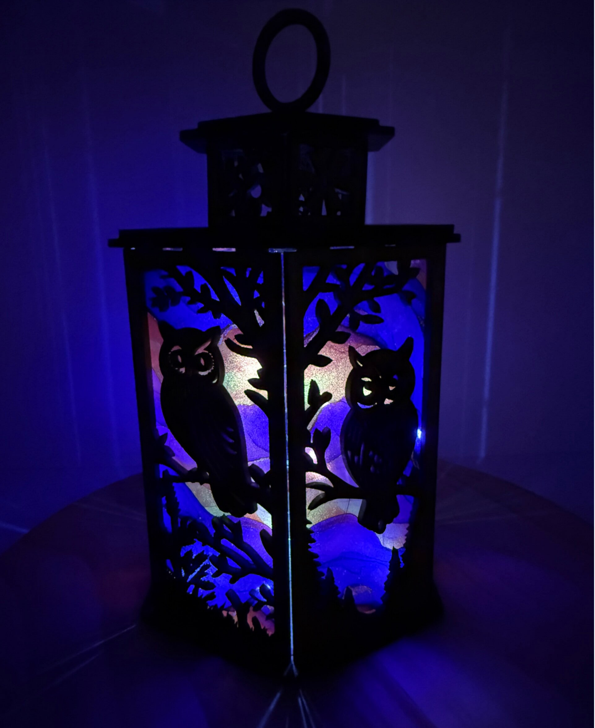 Made out of Basswood. It has been stained with Varathane Kona.  The height is 8.5" and the width is 6".  Comes with 7' battery operated fairy lights.  The pics are of the product you will receive.