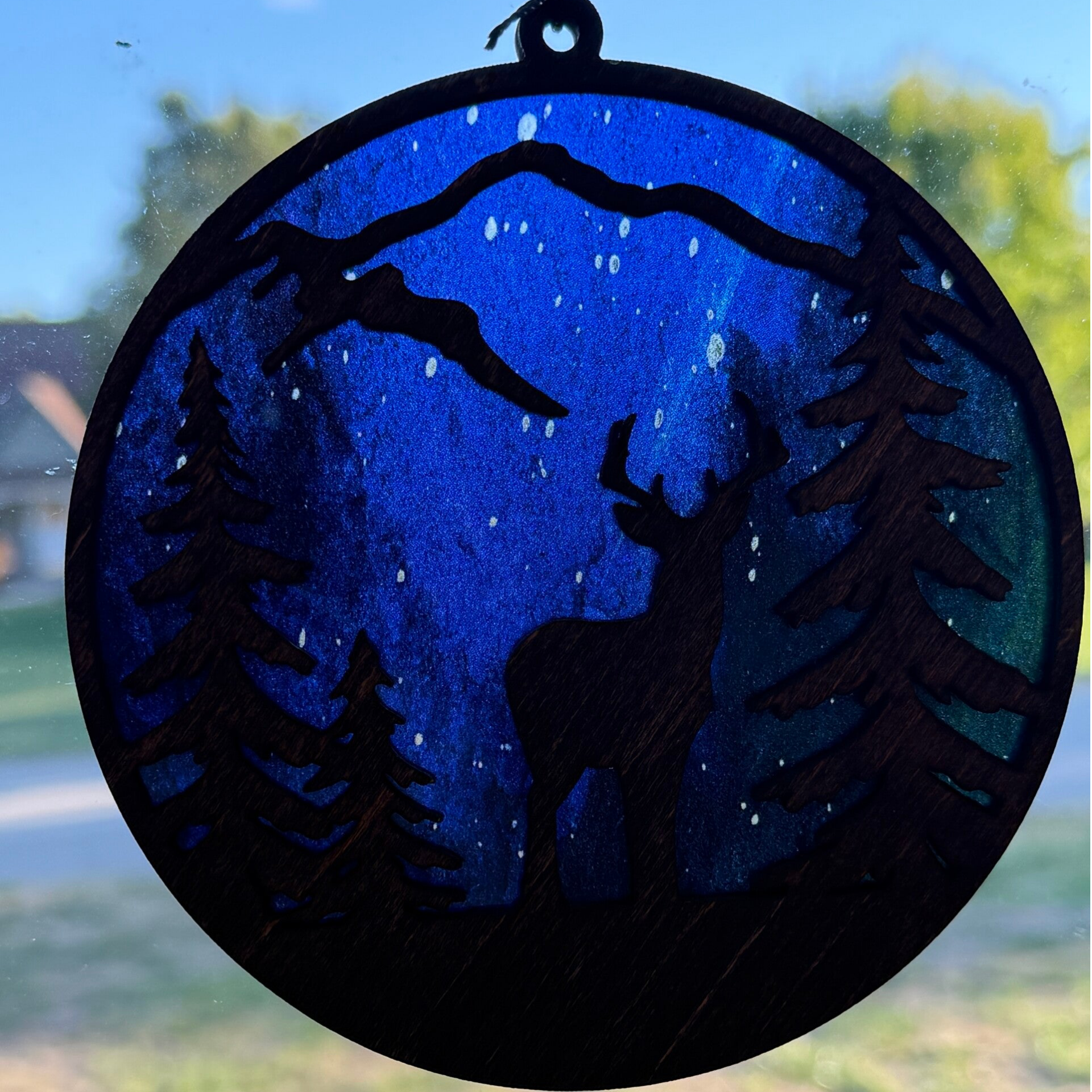 Made out of basswood. It is 5" tall and comes with a suction cup to hang in your window. The color ply used is lightweight and transparent. The picture is the exact one you will receive.