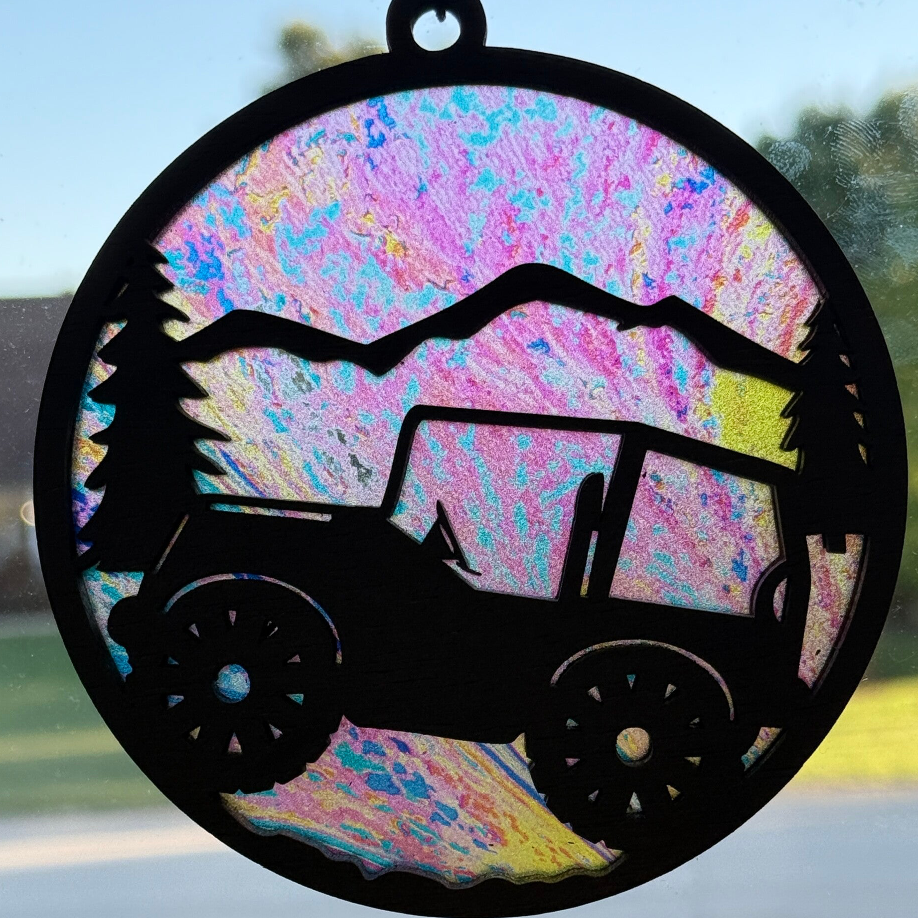 Made out of basswood. It is 5.5" high and comes with a suction cup to hang in your window. The color ply used is lightweight and transparent. The picture is the exact one you will receive.