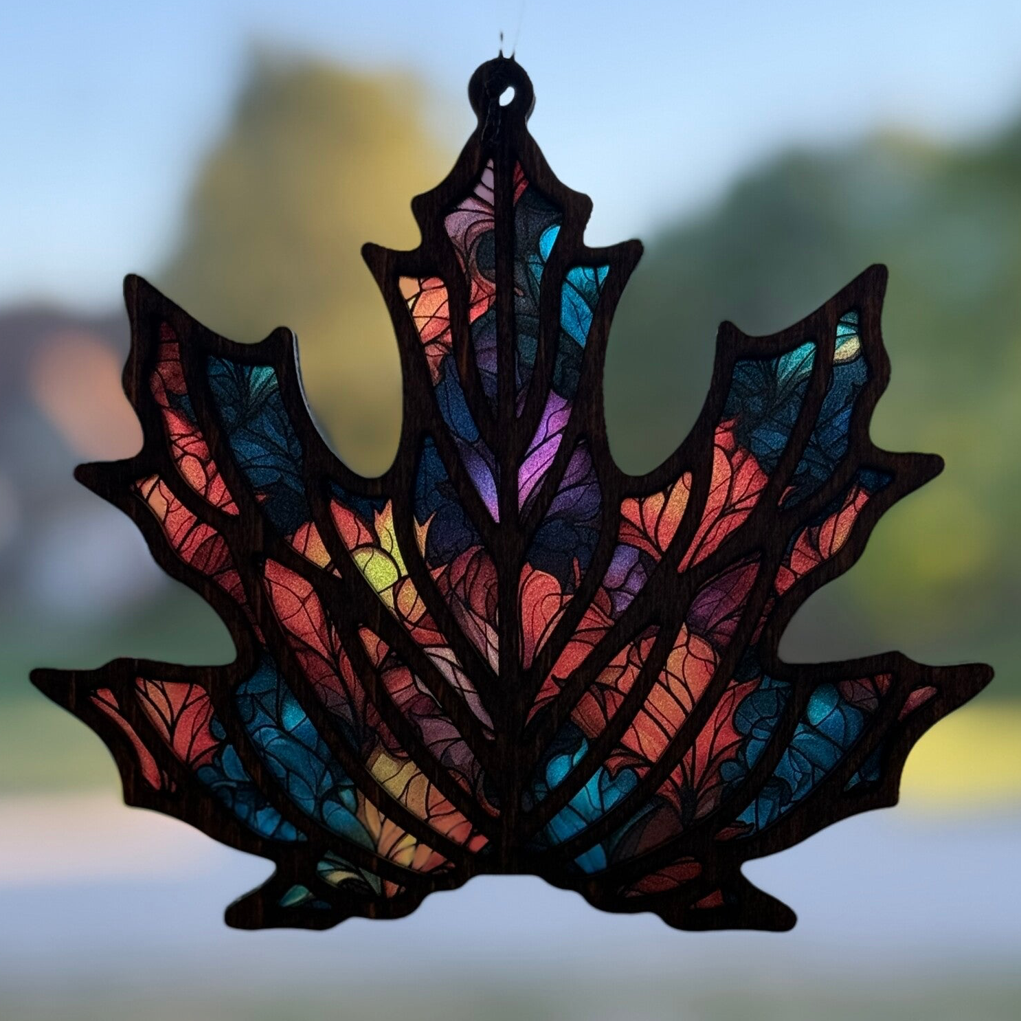 Made out of basswood. It is 5.5" wide and comes with a suction cup to hang in your window. The color ply used is lightweight and transparent. The picture is the exact one you will receive.