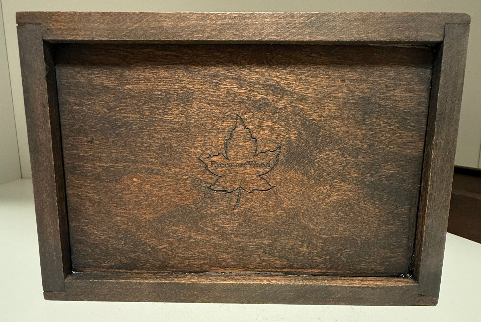 Made out of 100% Cherry wood. It has a high end rubio monocoat charcoal stain on it. Hight is 4.5". Width is 7" and the depth is 4.75". Perfect for small index cards used to write recipes on.