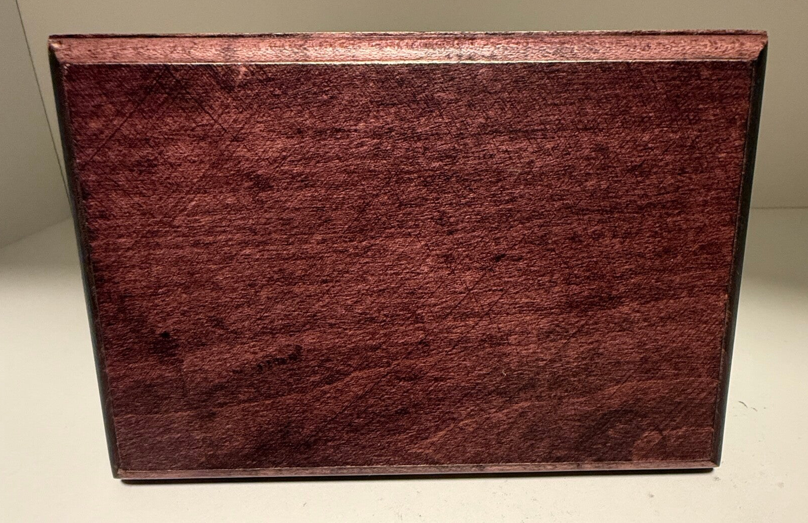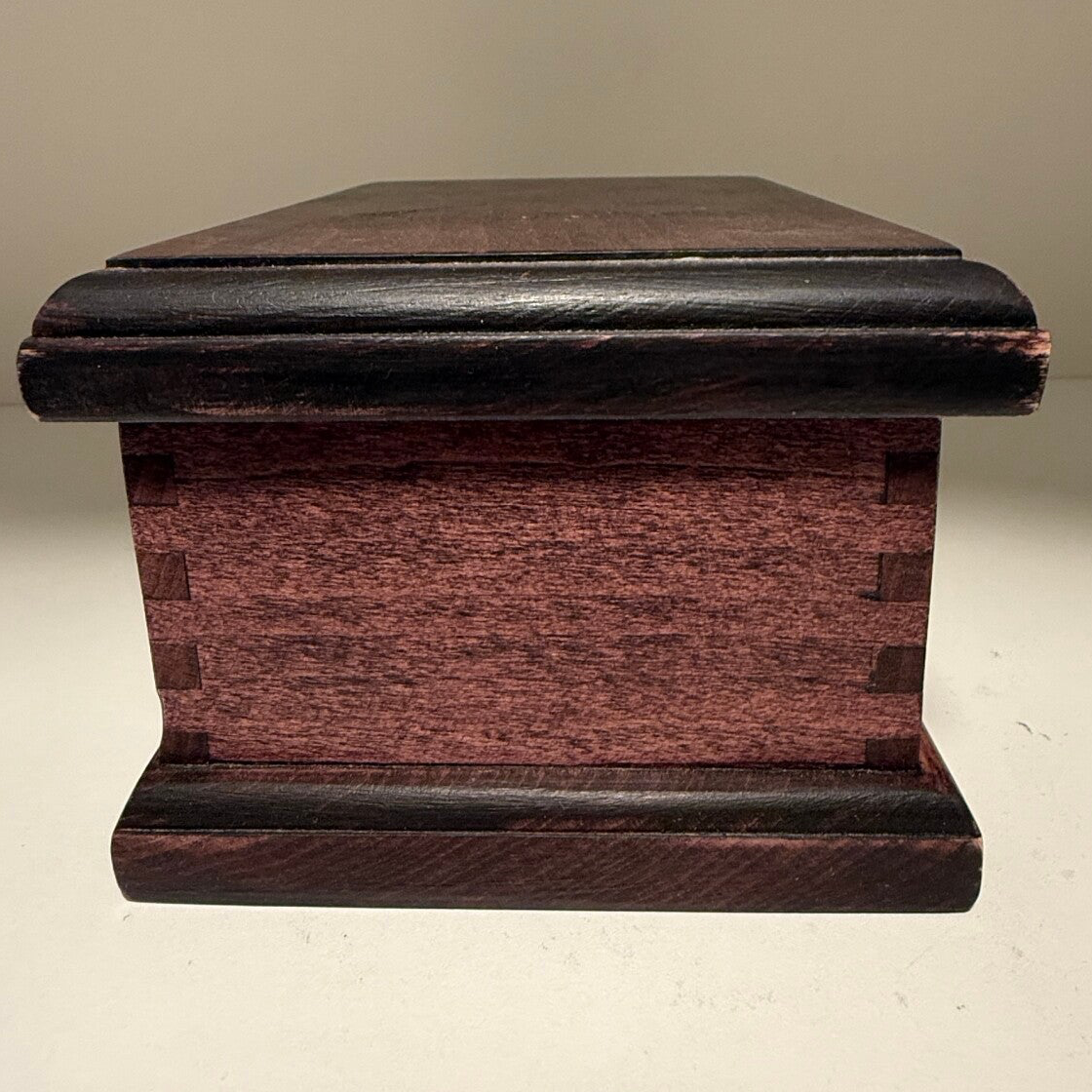 Made out of Maple wood. This keepsake box features box joints and a classic base and top custom fit bottom and lid. Dimensions are 3" high, 6.5" wide, and a width of 4".  The pictures are of the item you will receive.
