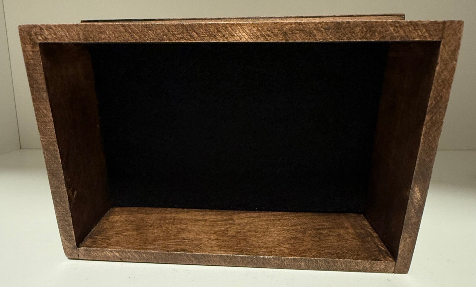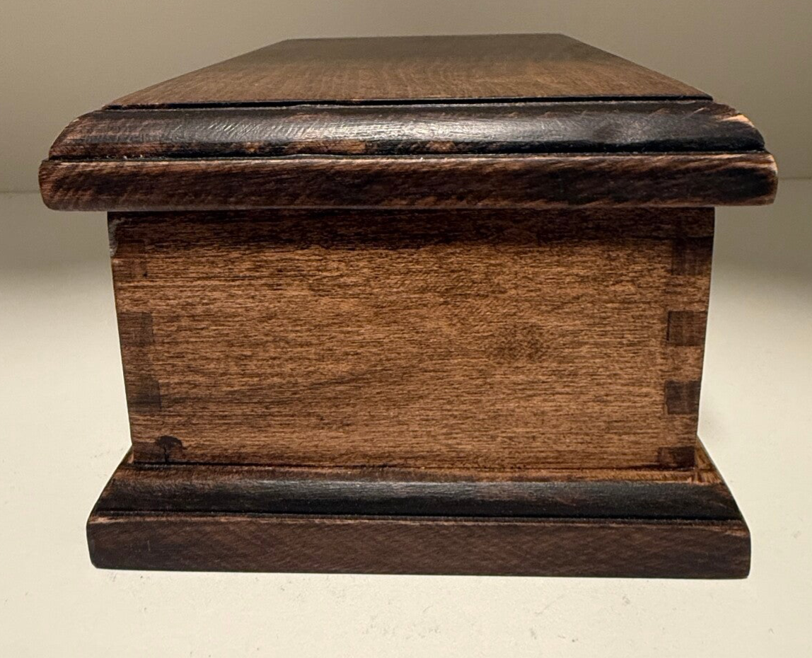 Made out of Maple wood. This keepsake box features box joints and a classic base and top custom fit bottom and lid. Dimensions are 3" high, 6.5" wide, and a width of 4". The pics are of the item you will receive.
