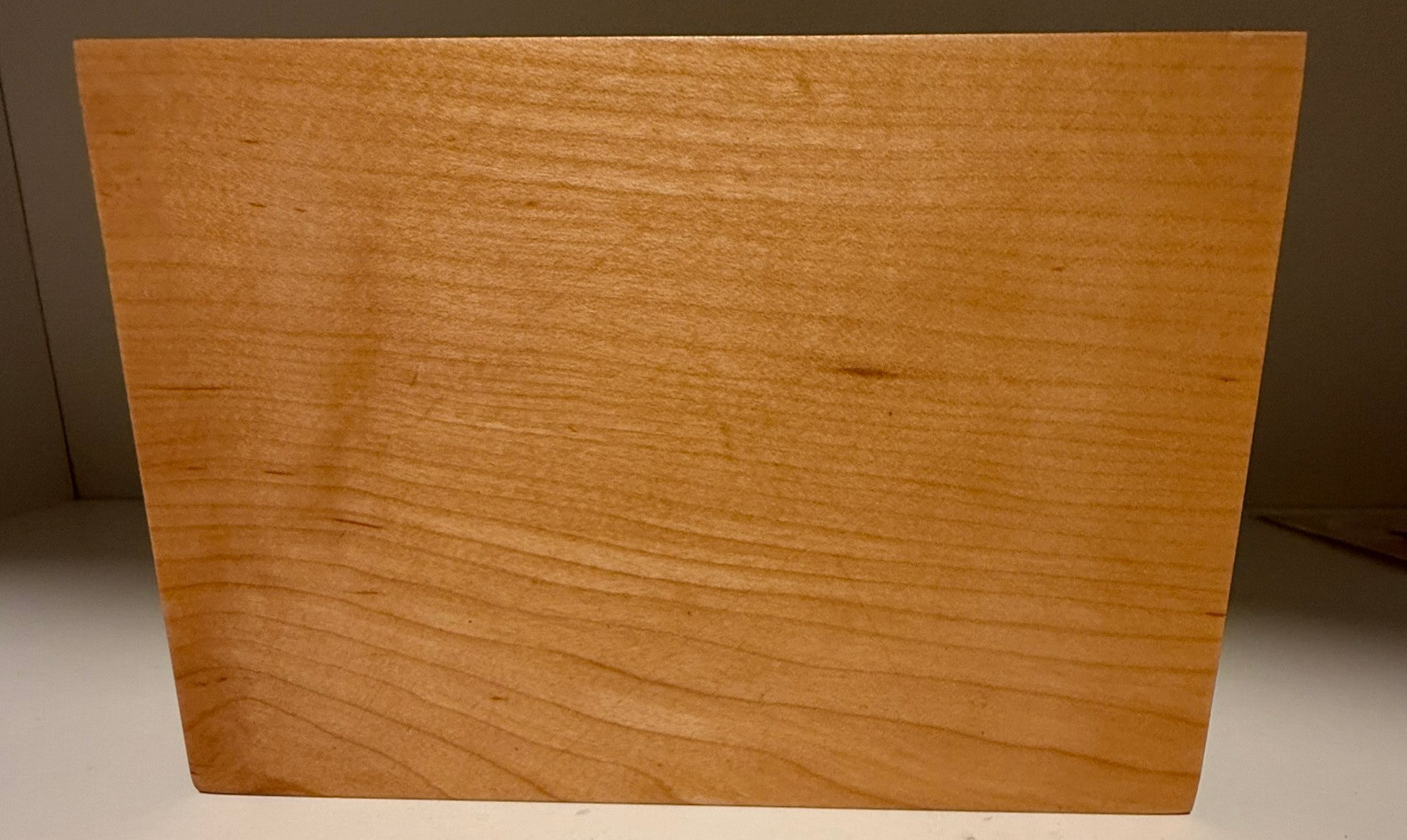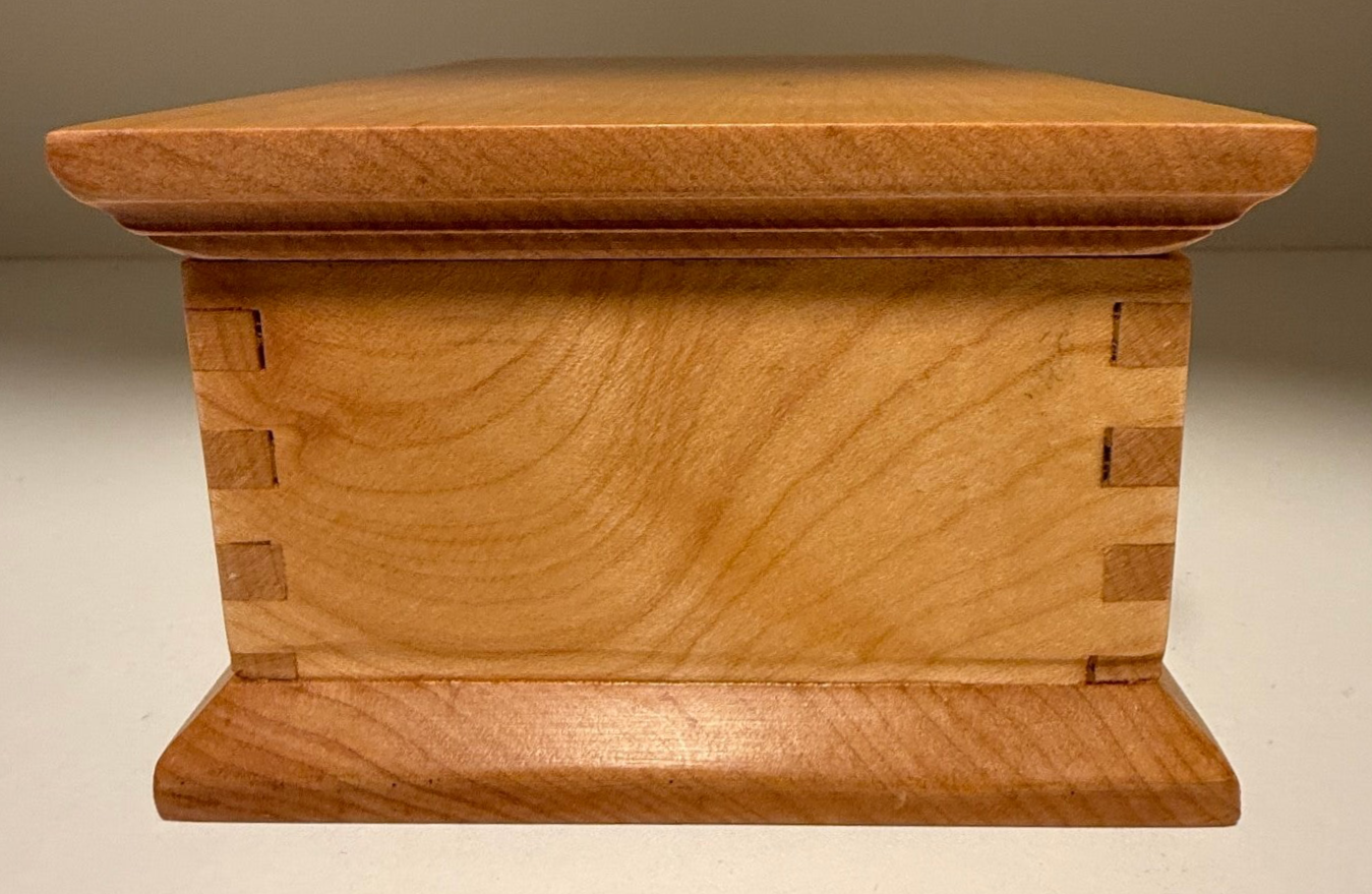 Made out of Maple wood. This keepsake box features box joints and a classic base and top custom fit bottom and lid. Dimensions are 3" high, 6.5" wide, and a width of 4". The pics are of the item you will receive.
